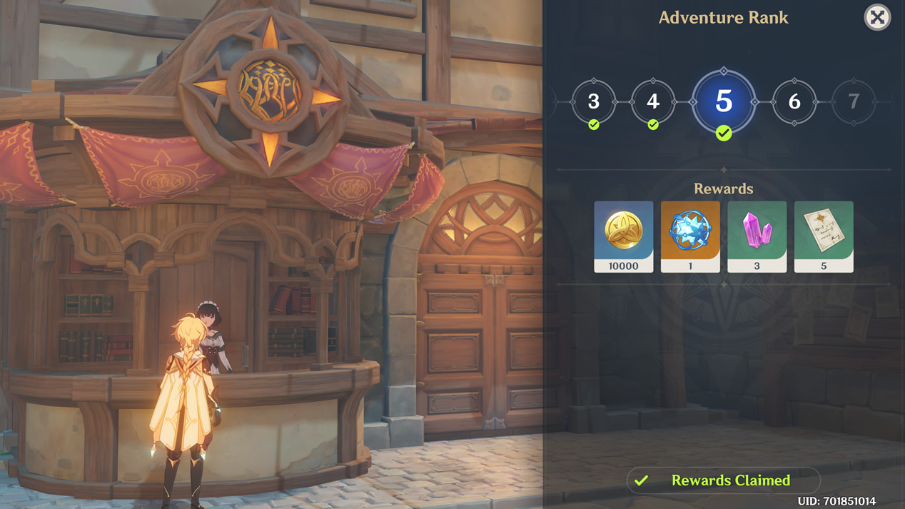 Don't forget that each time you raise your Adventure Rank, you can head to Mondstadt and talk to Katheryne at the Adventurer's Guild booth near the entrance in order to get additional rewards for each rank up. These scale, starting out quite modest and getting quite impressive over time.
