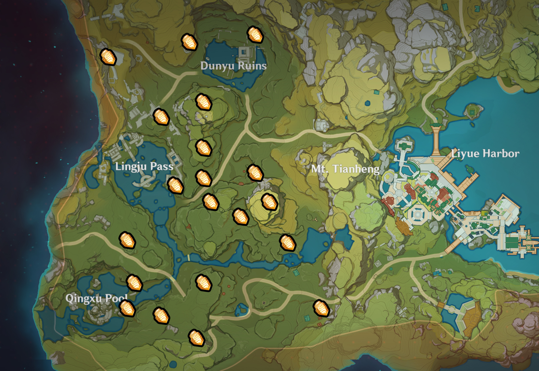 This area holds around 20-24 Cor Lapis, depending on how thorough you want to be. Try teleporting to the highest locations to make quick work of the route, so use the Qingxu Pool Waypoint, and head north to sweep up a few nodes there. Then use the South Lisha Waypoint, Lisha Waypoint, Lingju Pass Waypoint, and finally, the Statue of the Seven all the way to the north just over the Dunyu Ruins.