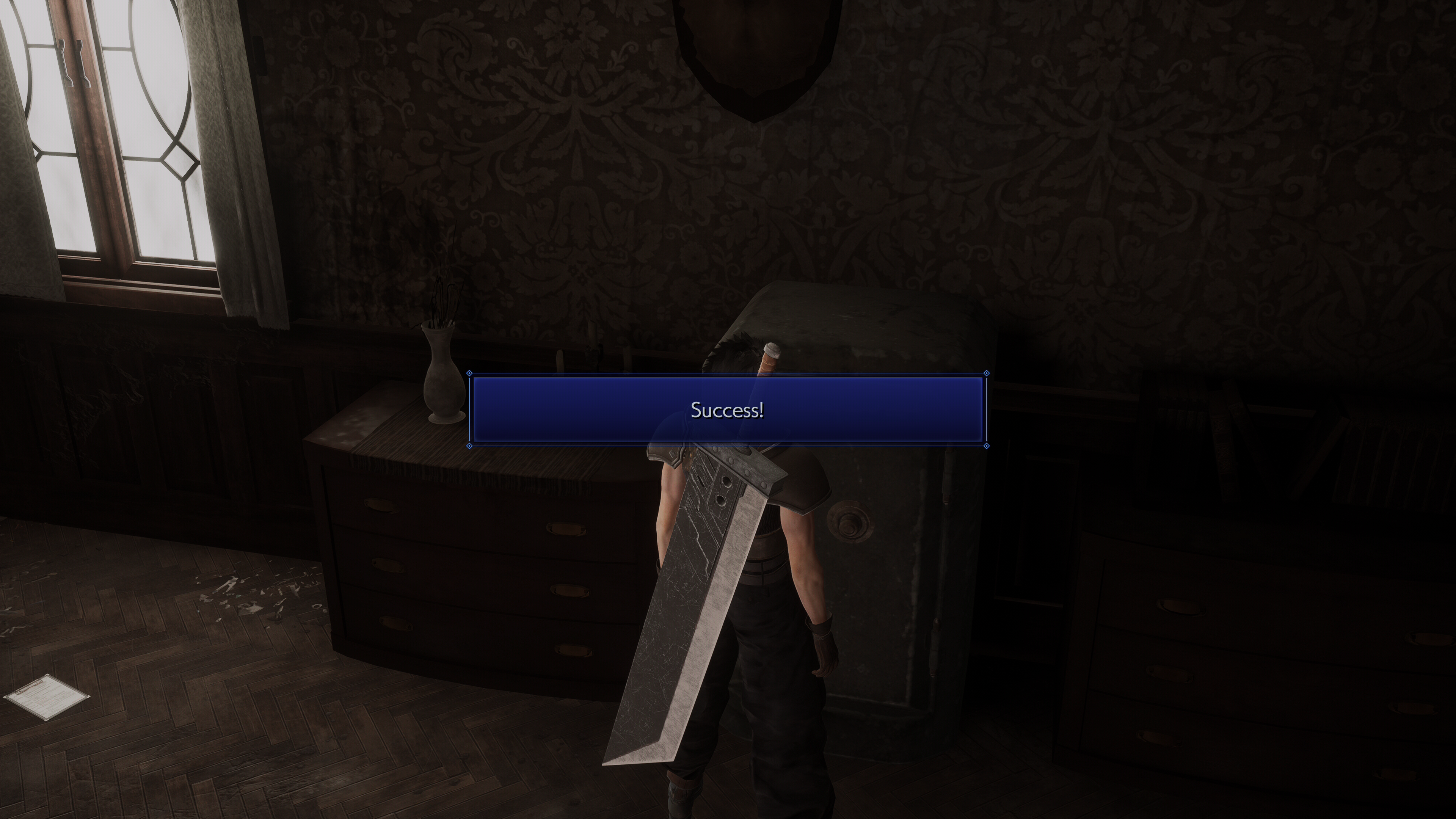 Head to the Manor via Nibelheim Outskirts, this time taking that western exit. Inside the manor, on the western side of the upper floor, you’ll find a room with a safe inside. We need to open the safe.