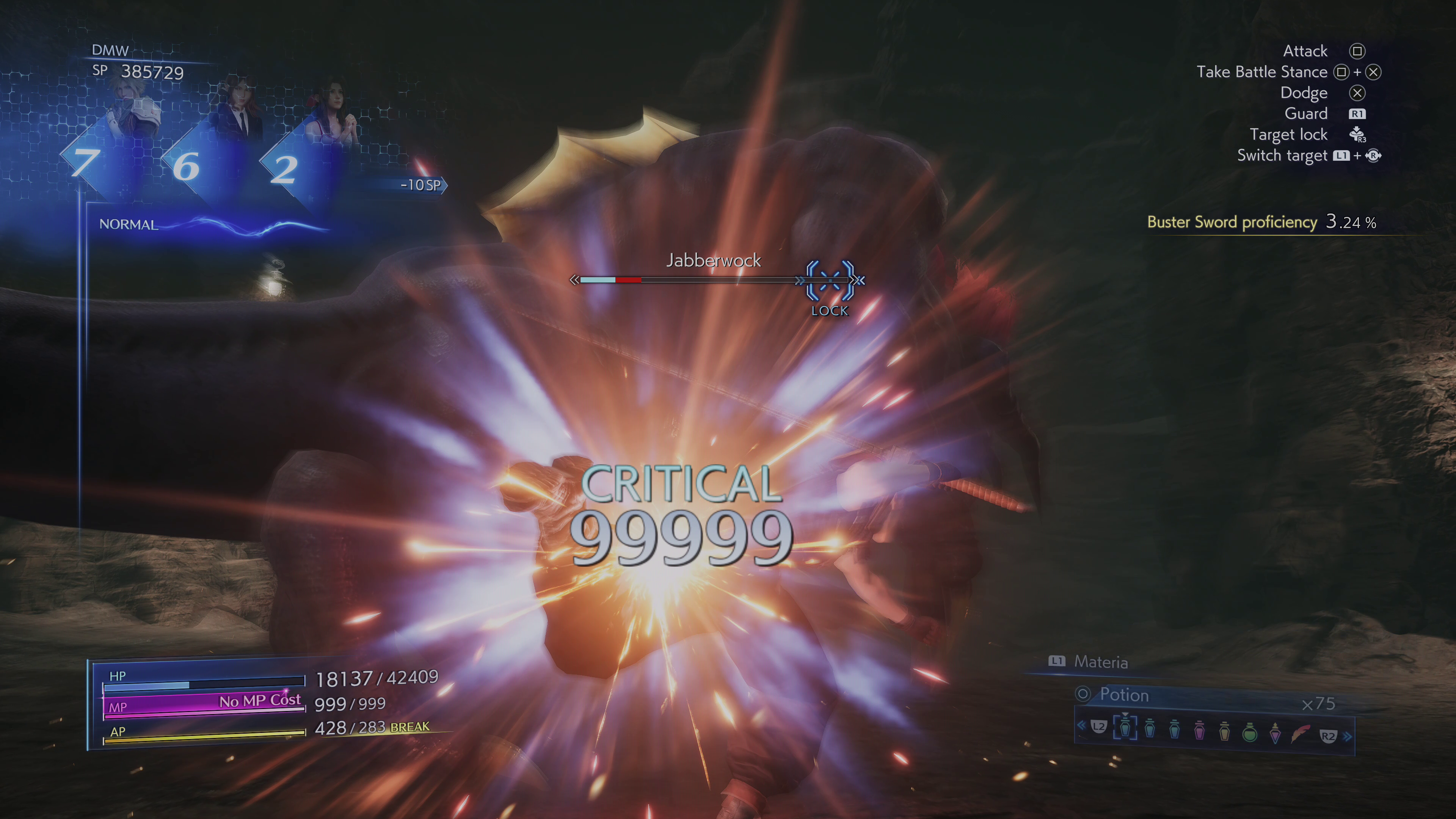 Once Zack gets his hands on the iconic Buster Sword at Chapter 6, which is roughly Crisis Core's halfway point, he unlocks a new mechanic, but only in Crisis Core Reunion, the remastered version of the game. This new mechanic, Buster Sword Proficiency, allows you to break the damage cap and deal 99,999 damage - but only in certain circumstances.