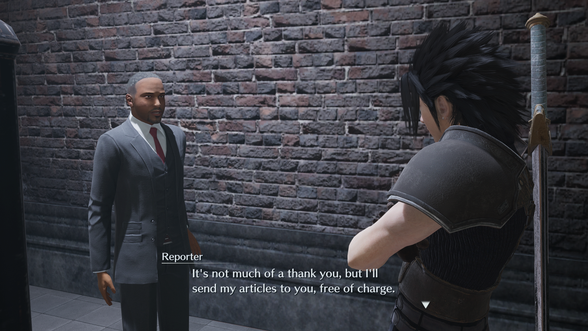 The reporter, a black man in a grey suit with a white shirt and red tie, is terrified of Zack on sight - because Zack is a Shinra employee, and he's currently trying to hide from Shinra forces. When you talk to him, you're faced with a simple choice: report him, or let him go.