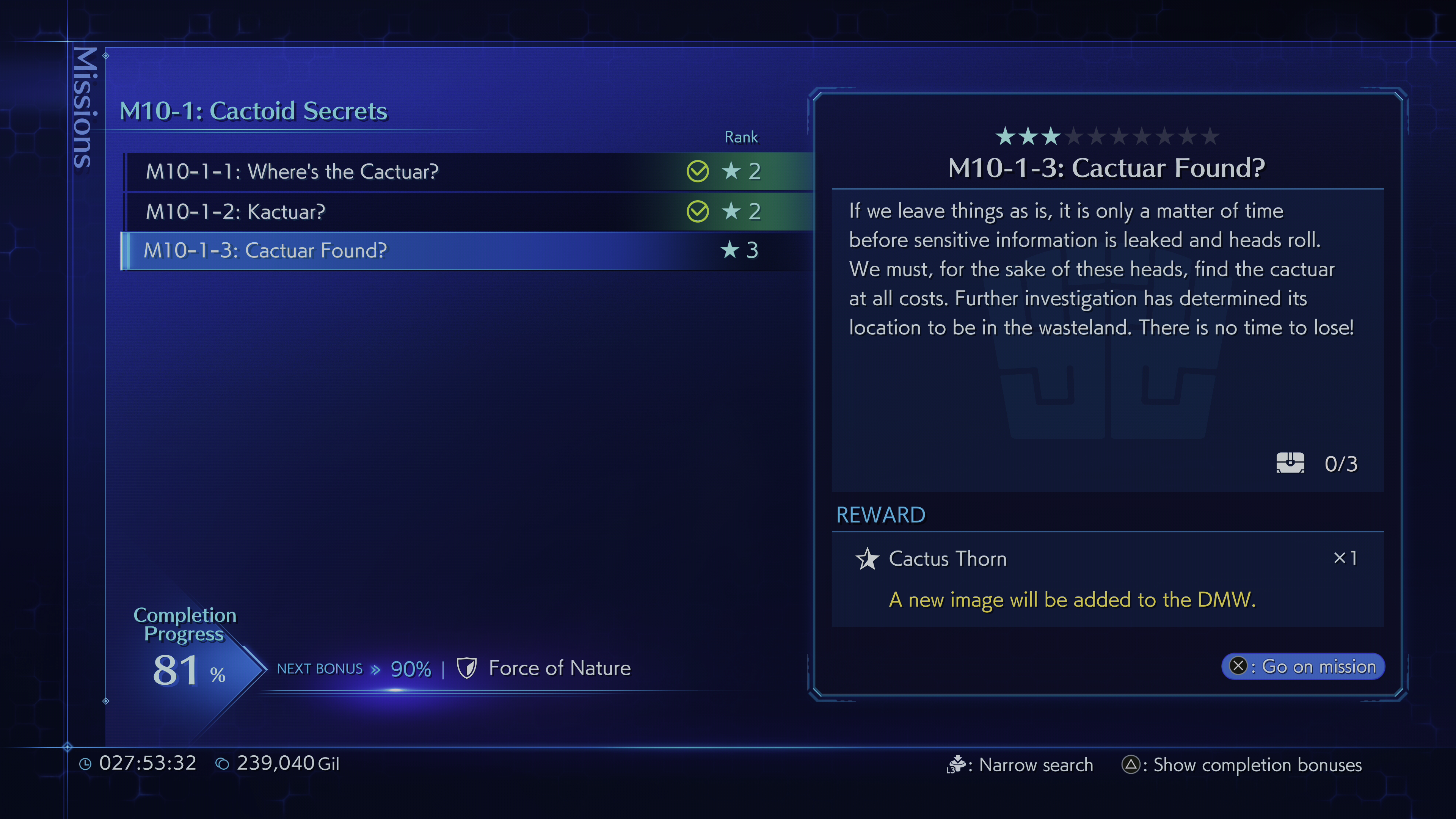 Once Mission 3-1-3 has been completed while also optionally taking down Kactuar, Mission 10-1 'Cactoid Secrets' unlocks.