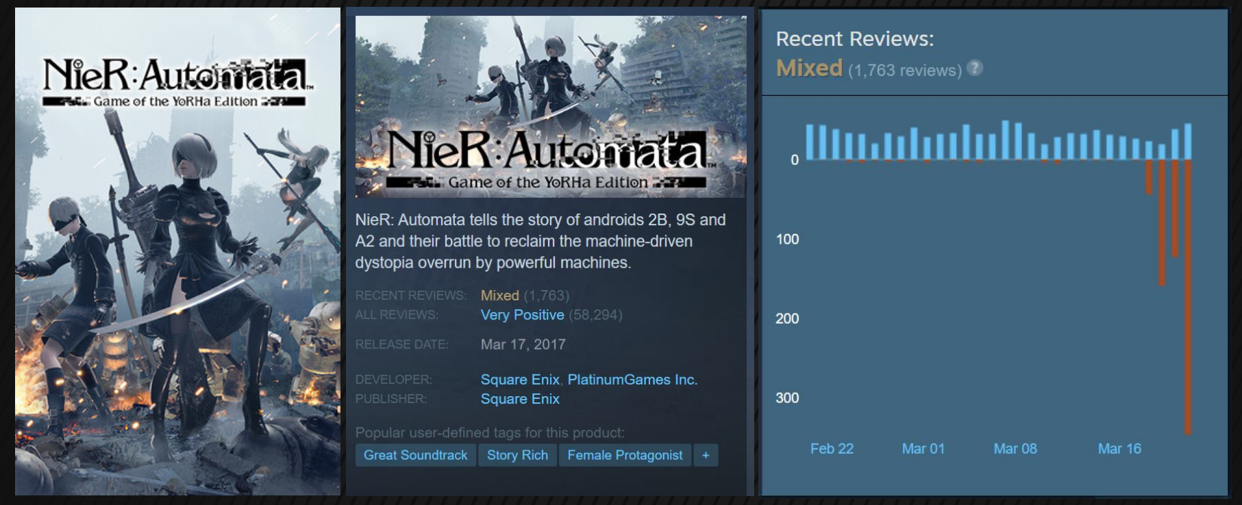 NieR Automata's recent review rating on Steam drops to mixed as users bomb score due to Microsoft Store port