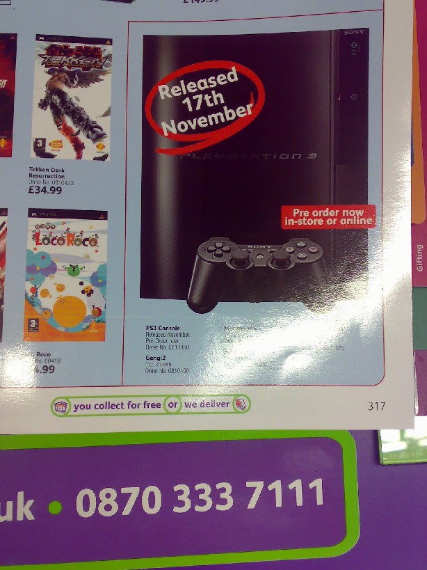 After speaking to multiple staff of different ranks and even the deputy manager of the store, they were still adamant you could preorder a PS3 console for £30 and "Walk away with it November 17th" though they "Didn't have a list of games for launch." The deputy told me "Word from head office is a delay is unlikely."