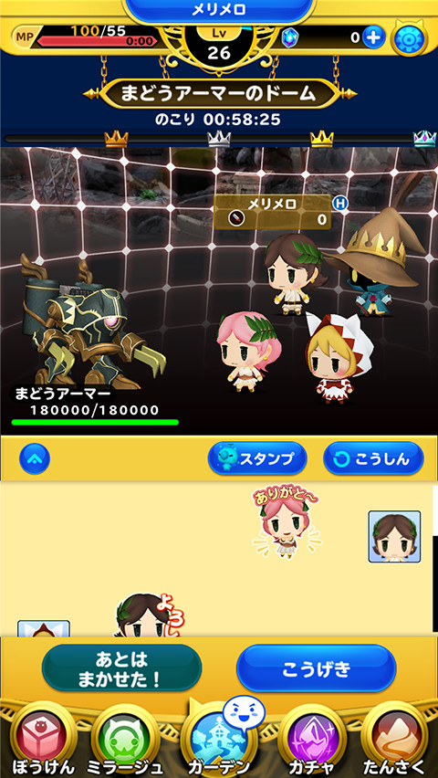 Battles take place largely automatically, but the player first must raise their Mirages with the gems gained while exploring, and players must learn how to stack Mirages in order to achieve special abilities. These special abilities include ultimate techniques as well as summoning cameo heroes from the Final Fantasy franchise.
