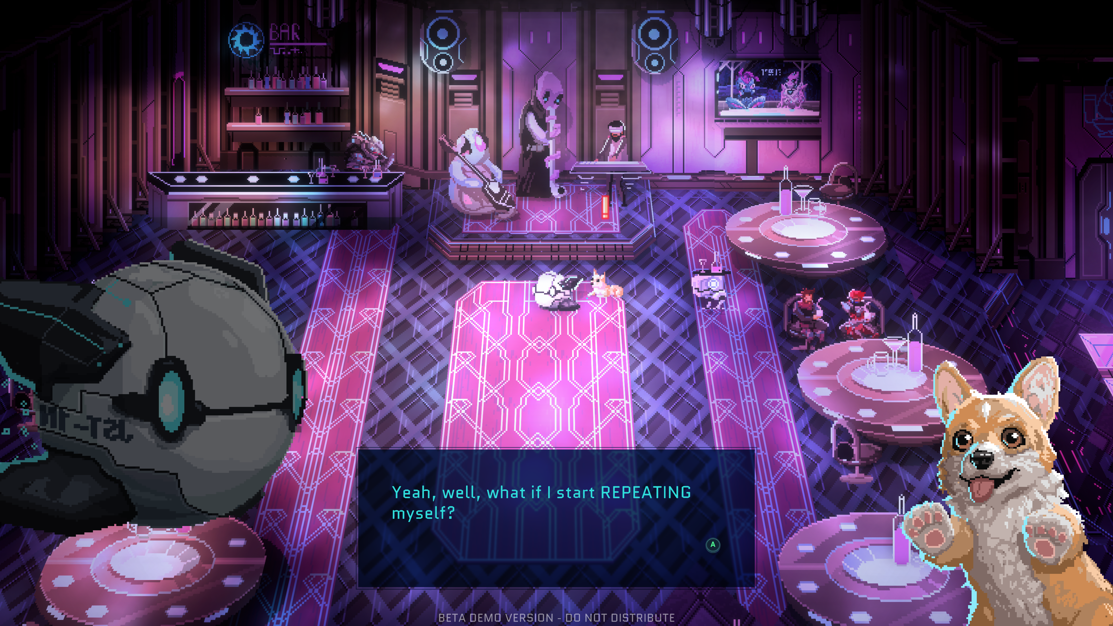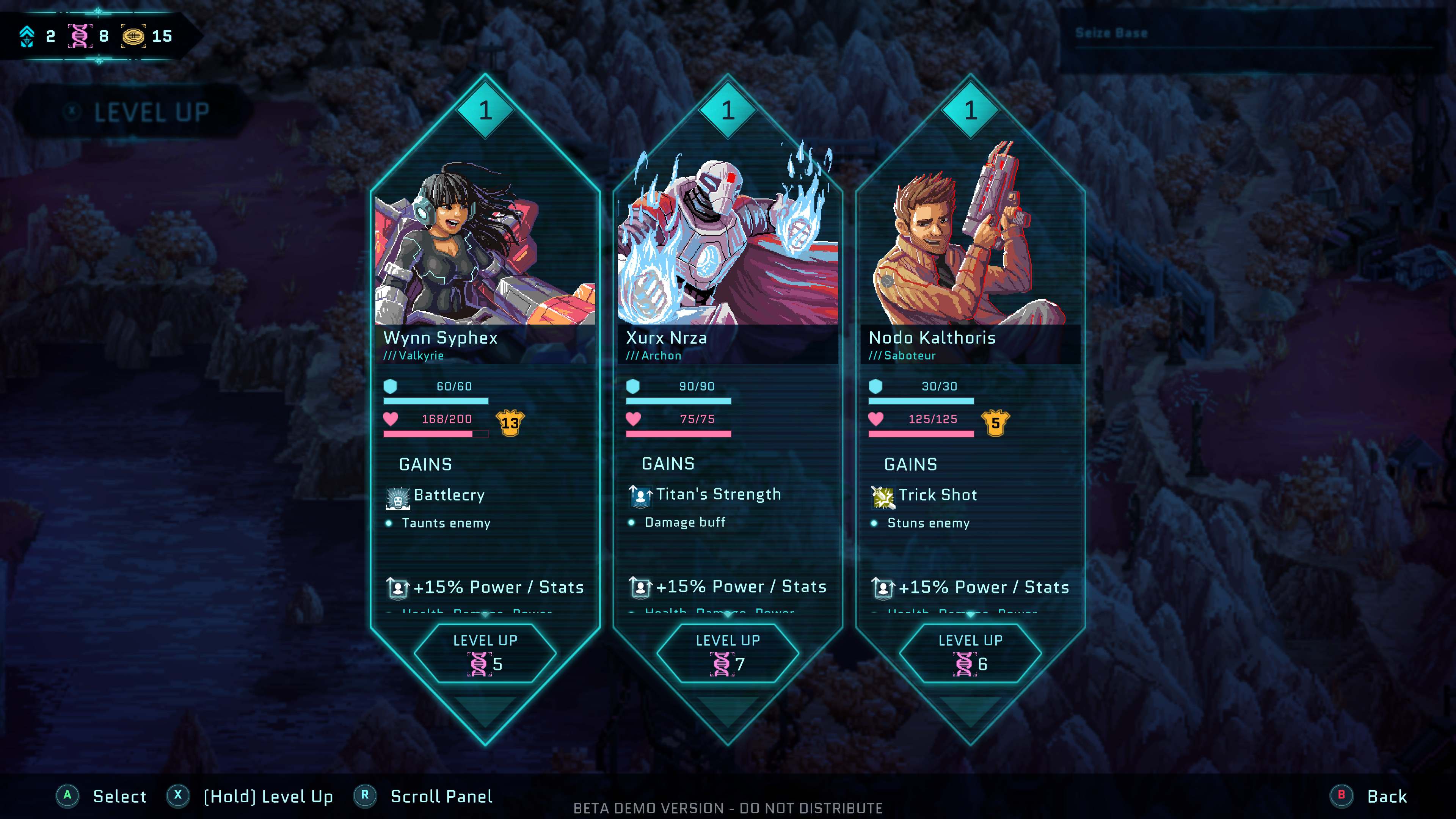 Star Renegades also does not seem to be strongly story-focused. There is a base motivation placed behind your Valkyrie class character, Wynn Syphex, but it's not outwardly the driving force of the game, although it is hard to tell in a preview build. There is some dialogue between your recruited characters during missions, which I can best describe as kinda snarky - trying to either be amusing or pull zingers, although it doesn't quite land most of the time.